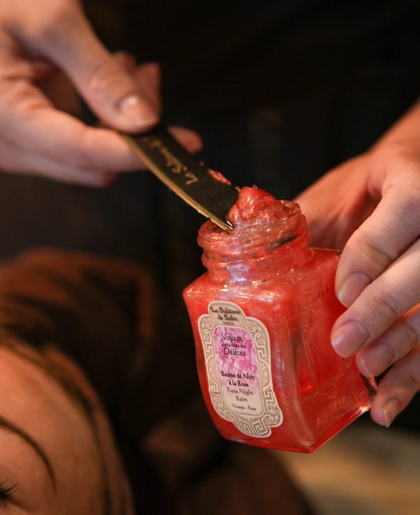 6) Massage visage, cou, nuque et décolleté au baume à la rose