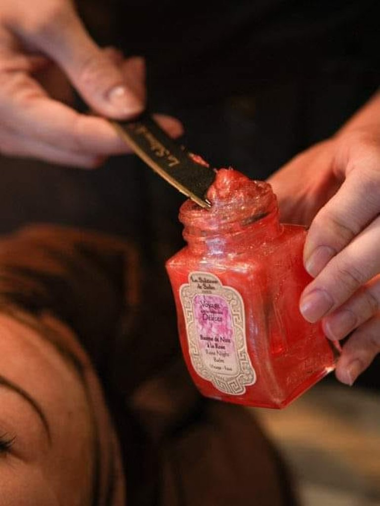 6) Massage visage, cou, nuque et décolleté au baume à la rose
